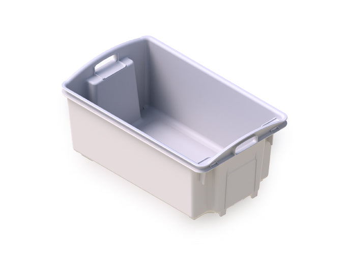 The AP12 Nesting Crate is a large, heavy-duty storage crate with a 55-litre capacity, designed for use in warehousing, food processing, agriculture, and logistics. Its strong build and generous internal volume make it ideal for transporting bulk goods, produce, or seafood while maintaining durability under repeated handling.